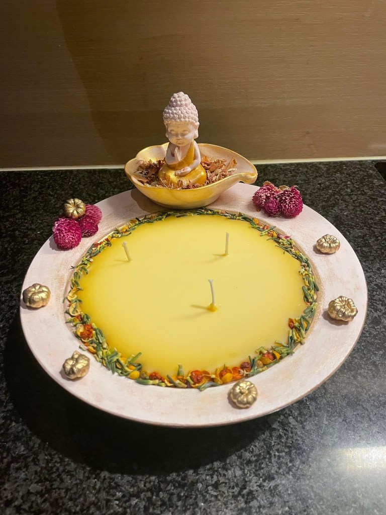 Bloemen, vormen en kleuren worden bewust gekozen zodat elke kaars een eigen uitstraling en energie krijgt.